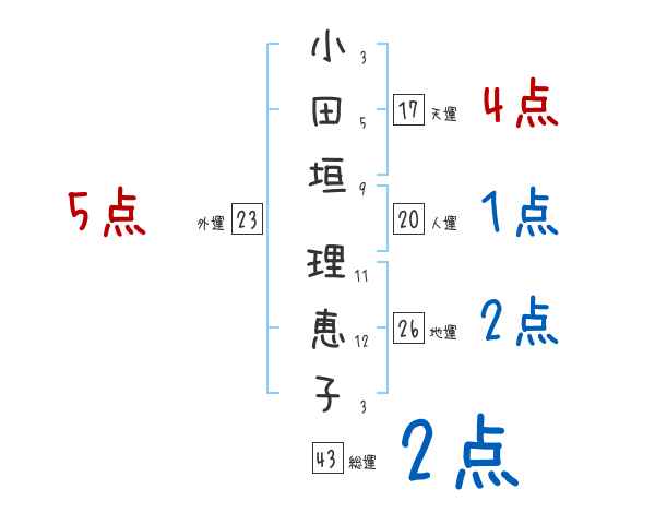 外運![]() | 小田垣理恵子さんの外運は23画の5つ星!想像力に優れ活力がある。一代で成功し名誉を手に入れる。 生活面を象徴する運勢です。外部から受ける影響力を表し、結婚運、家庭運や職場、環境への順応性を表します。 |