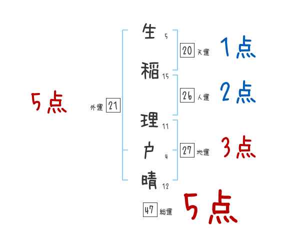 総運![]() | 生稲理戸晴さんの総運は47画の5つ星!実力が開花し発展する円満な人生。財に恵まれる。 あなたの人生を表す1番重要な運勢です。生涯を通じて影響する総合運となり、主に50歳以降の晩年期に影響を及ぼします。 |