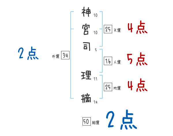 天運![]() | 神宮司理摘さんの天運は25画の4つ星!個性があり才能があふれる。強運の持ち主で発展する。 家系が持つ宿命的な運勢を表します。祖先から受け継いだ苗字ですので自分の力が及びません。家柄を象徴します。 |