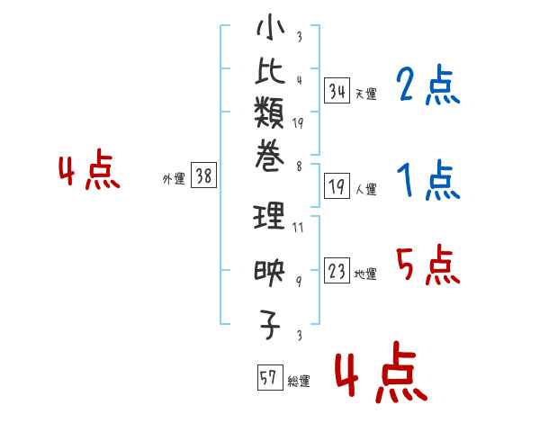 外運![]() | 小比類巻理映子さんの外運は38画の4つ星!温厚な性格で技術的な才能を発揮する。職人的な仕事に向いている。 生活面を象徴する運勢です。外部から受ける影響力を表し、結婚運、家庭運や職場、環境への順応性を表します。 |
