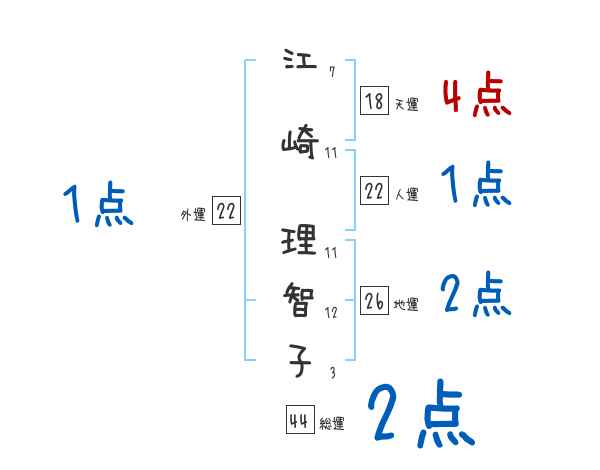 天運![]() | 江崎理智子さんの天運は18画の4つ星!情熱的で剛気。忍耐力があり信頼される。 家系が持つ宿命的な運勢を表します。祖先から受け継いだ苗字ですので自分の力が及びません。家柄を象徴します。 |