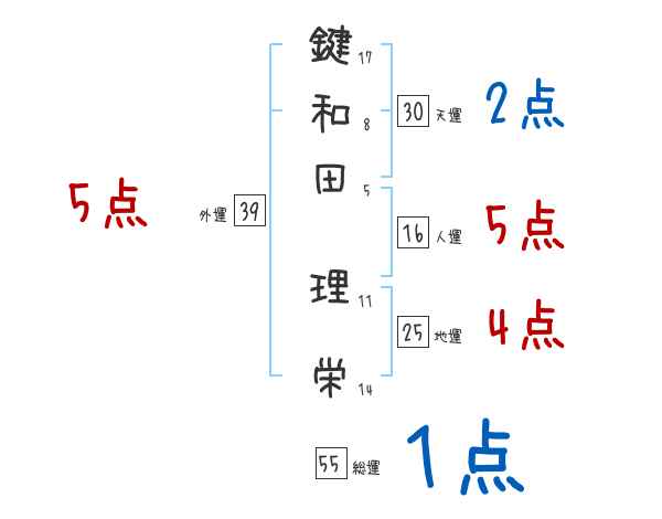 外運![]() | 鍵和田理栄さんの外運は39画の5つ星!社交性に優れ人望が厚い。人の上に立ち成功する。 生活面を象徴する運勢です。外部から受ける影響力を表し、結婚運、家庭運や職場、環境への順応性を表します。 |