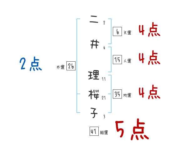 天運![]() | 二井理桜子さんの天運は6画の4つ星!慎重な努力家で信頼を得る。誠実な精神で向上心に優れる。 家系が持つ宿命的な運勢を表します。祖先から受け継いだ苗字ですので自分の力が及びません。家柄を象徴します。 |