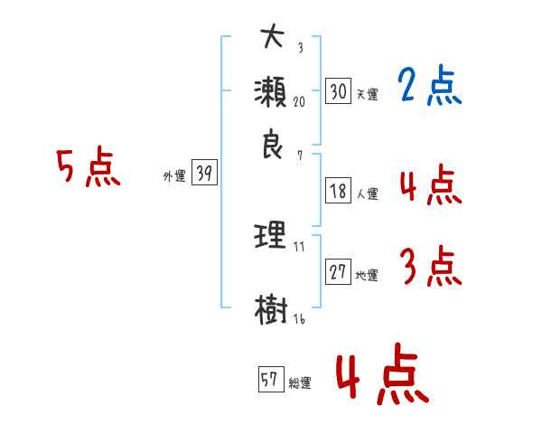 外運![]() | 大瀬良理樹さんの外運は39画の5つ星!社交性に優れ人望が厚い。人の上に立ち成功する。 生活面を象徴する運勢です。外部から受ける影響力を表し、結婚運、家庭運や職場、環境への順応性を表します。 |