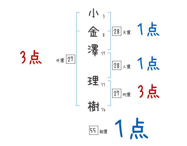 天運![]() | 小金澤理樹さんの天運は28画の1つ星!家庭環境に注意。スポーツで活躍できる能力があるかも。 家系が持つ宿命的な運勢を表します。祖先から受け継いだ苗字ですので自分の力が及びません。家柄を象徴します。 |