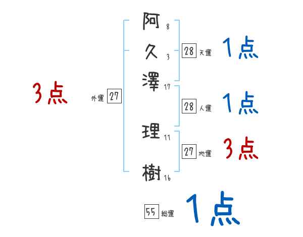 天運![]() | 阿久澤理樹さんの天運は28画の1つ星!家庭環境に注意。スポーツで活躍できる能力があるかも。 家系が持つ宿命的な運勢を表します。祖先から受け継いだ苗字ですので自分の力が及びません。家柄を象徴します。 |