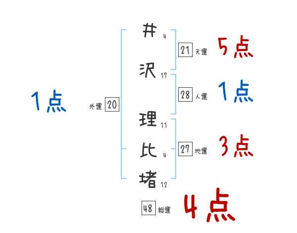 天運![]() | 井沢理比堵さんの天運は21画の5つ星!統率力がある。独立し成功する。名誉を手に入れる。 家系が持つ宿命的な運勢を表します。祖先から受け継いだ苗字ですので自分の力が及びません。家柄を象徴します。 |