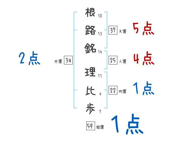 地運![]() | 根路銘理比歩さんの地運は22画の1つ星!努力することが苦手ないっぽう手先が器用。芸術性にも優れる。 個性を表す基礎的な運勢です。性格形成や対人関係、行動力など家庭環境に影響されます。主に誕生してから20歳くらいまでの若年期の運勢を表します。 |