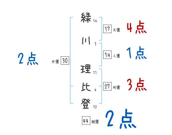 総運![]() | 緑川理比登さんの総運は44画の2つ星!誠実で慎重な性格。物事を考えすぎないように注意しましょう。 あなたの人生を表す1番重要な運勢です。生涯を通じて影響する総合運となり、主に50歳以降の晩年期に影響を及ぼします。 |
