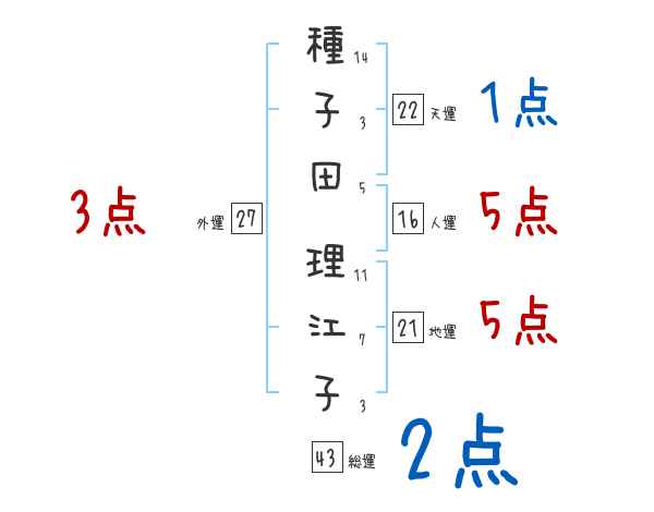 人運![]() | 種子田理江子さんの人運は16画の5つ星!人望が厚く大きく発展する。逆転成功が見える。 性格や才能などを表す2番目に重要な運勢です。人間関係や協調性、社会的な成功に影響します。主に20歳から50歳ぐらいまでの中年期の運勢を表します。 |