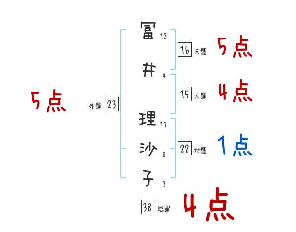 外運![]() | 冨井理沙子さんの外運は23画の5つ星!想像力に優れ活力がある。一代で成功し名誉を手に入れる。 生活面を象徴する運勢です。外部から受ける影響力を表し、結婚運、家庭運や職場、環境への順応性を表します。 |