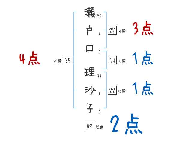 外運![]() | 瀬戸口理沙子さんの外運は35画の4つ星!温厚な性格で感受性が高い。穏和な性格で人望が厚い。 生活面を象徴する運勢です。外部から受ける影響力を表し、結婚運、家庭運や職場、環境への順応性を表します。 |