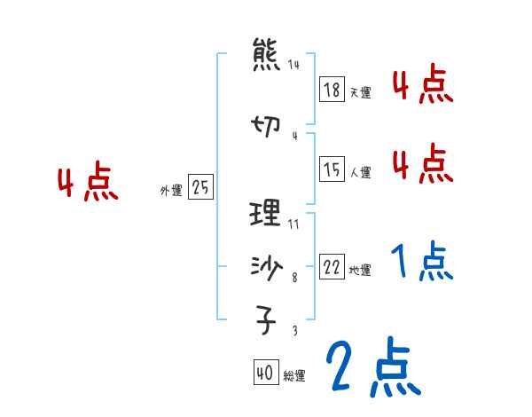 天運![]() | 熊切理沙子さんの天運は18画の4つ星!情熱的で剛気。忍耐力があり信頼される。 家系が持つ宿命的な運勢を表します。祖先から受け継いだ苗字ですので自分の力が及びません。家柄を象徴します。 |