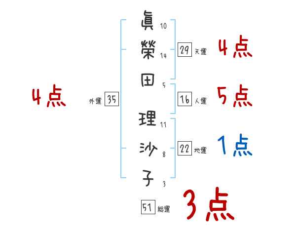 天運![]() | 眞榮田理沙子さんの天運は29画の4つ星!完全主義で才能がある。厳格な心の持ち主。 家系が持つ宿命的な運勢を表します。祖先から受け継いだ苗字ですので自分の力が及びません。家柄を象徴します。 |