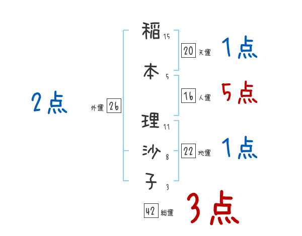外運![]() | 稲本理沙子さんの外運は26画の2つ星!波瀾万丈かも。信頼できる人を大事にしましょう。 生活面を象徴する運勢です。外部から受ける影響力を表し、結婚運、家庭運や職場、環境への順応性を表します。 |
