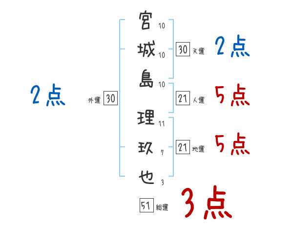 外運![]() | 宮城島理玖也さんの外運は30画の2つ星!浮き沈みの激しさに注意しましょう。 生活面を象徴する運勢です。外部から受ける影響力を表し、結婚運、家庭運や職場、環境への順応性を表します。 |