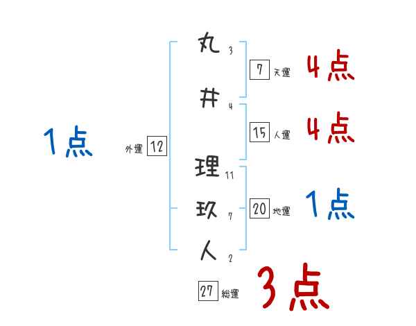 天運![]() | 丸井理玖人さんの天運は7画の4つ星!強い意志や信念を持ち独立心が強い。自立する。 家系が持つ宿命的な運勢を表します。祖先から受け継いだ苗字ですので自分の力が及びません。家柄を象徴します。 |