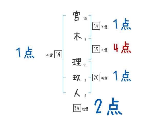 外運![]() | 宮木理玖人さんの外運は19画の1つ星!優れた才能を持ちますが、協調性が足りないことも。周りの人と協力する事を意識しましょう。 生活面を象徴する運勢です。外部から受ける影響力を表し、結婚運、家庭運や職場、環境への順応性を表します。 |