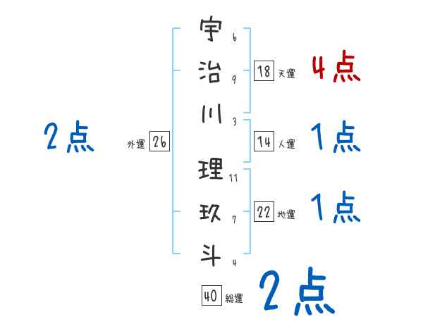 天運![]() | 宇治川理玖斗さんの天運は18画の4つ星!情熱的で剛気。忍耐力があり信頼される。 家系が持つ宿命的な運勢を表します。祖先から受け継いだ苗字ですので自分の力が及びません。家柄を象徴します。 |