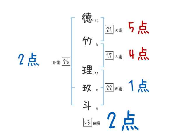 天運![]() | 徳竹理玖斗さんの天運は21画の5つ星!統率力がある。独立し成功する。名誉を手に入れる。 家系が持つ宿命的な運勢を表します。祖先から受け継いだ苗字ですので自分の力が及びません。家柄を象徴します。 |