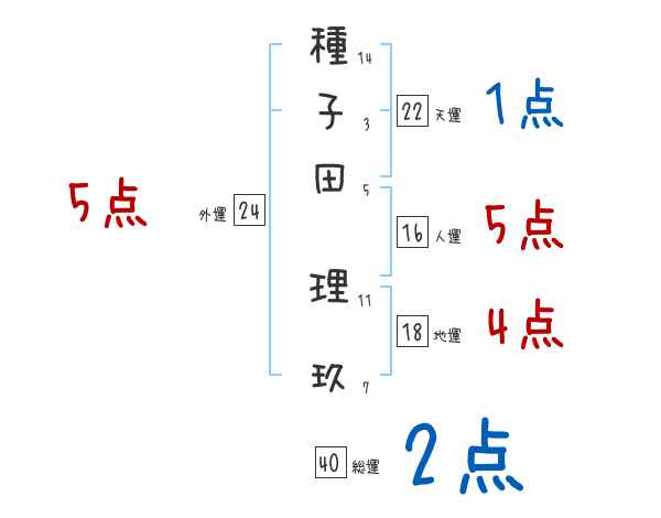 外運![]() | 種子田理玖さんの外運は24画の5つ星!家庭運が良く順調な人生。金運にも恵まれる。 生活面を象徴する運勢です。外部から受ける影響力を表し、結婚運、家庭運や職場、環境への順応性を表します。 |