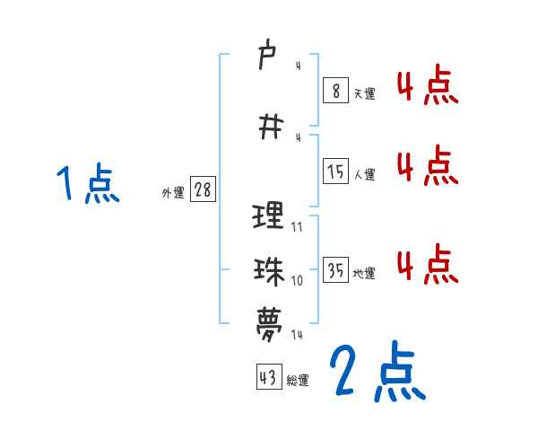 外運![]() | 戸井理珠夢さんの外運は28画の1つ星!家庭環境に注意。スポーツで活躍できる能力があるかも。 生活面を象徴する運勢です。外部から受ける影響力を表し、結婚運、家庭運や職場、環境への順応性を表します。 |