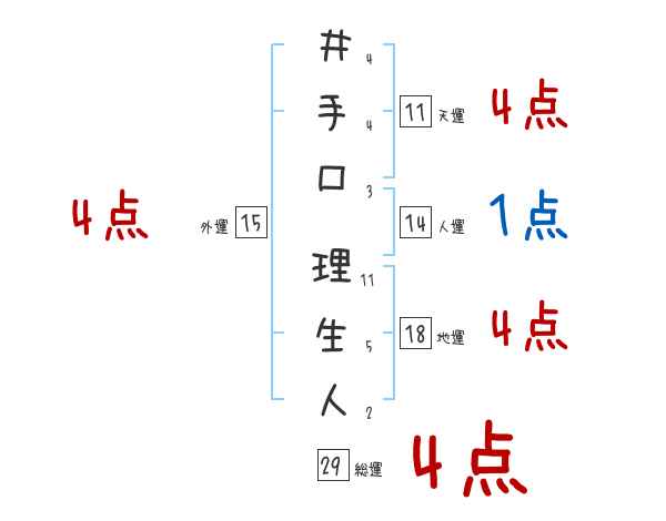 天運![]() | 井手口理生人さんの天運は11画の4つ星!着実に富や地位を得る幸運な人生。 家系が持つ宿命的な運勢を表します。祖先から受け継いだ苗字ですので自分の力が及びません。家柄を象徴します。 |