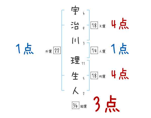 総運![]() | 宇治川理生人さんの総運は36画の3つ星!先見性が豊かです。多少神経質で苦労することも。 あなたの人生を表す1番重要な運勢です。生涯を通じて影響する総合運となり、主に50歳以降の晩年期に影響を及ぼします。 |