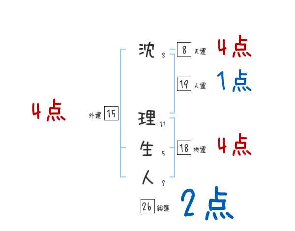 外運![]() | 沈理生人さんの外運は15画の4つ星!人徳があり出世する。順調に物事を進め円満な人生。 生活面を象徴する運勢です。外部から受ける影響力を表し、結婚運、家庭運や職場、環境への順応性を表します。 |