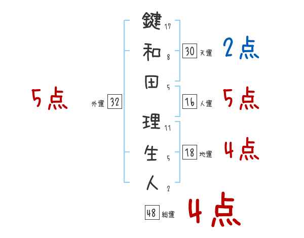 人運![]() | 鍵和田理生人さんの人運は16画の5つ星!人望が厚く大きく発展する。逆転成功が見える。 性格や才能などを表す2番目に重要な運勢です。人間関係や協調性、社会的な成功に影響します。主に20歳から50歳ぐらいまでの中年期の運勢を表します。 |