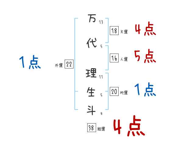 天運![]() | 万代理生斗さんの天運は18画の4つ星!情熱的で剛気。忍耐力があり信頼される。 家系が持つ宿命的な運勢を表します。祖先から受け継いだ苗字ですので自分の力が及びません。家柄を象徴します。 |