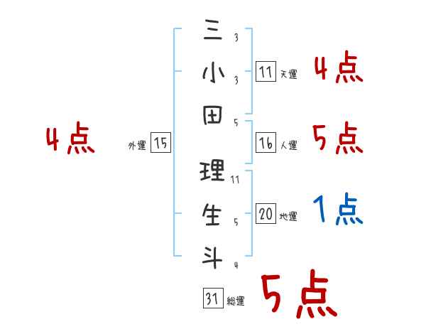 人運![]() | 三小田理生斗さんの人運は16画の5つ星!人望が厚く大きく発展する。逆転成功が見える。 性格や才能などを表す2番目に重要な運勢です。人間関係や協調性、社会的な成功に影響します。主に20歳から50歳ぐらいまでの中年期の運勢を表します。 |