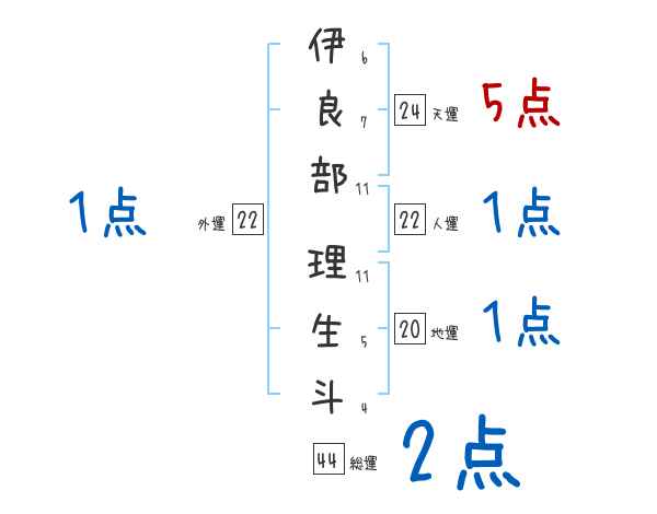 総運![]() | 伊良部理生斗さんの総運は44画の2つ星!誠実で慎重な性格。物事を考えすぎないように注意しましょう。 あなたの人生を表す1番重要な運勢です。生涯を通じて影響する総合運となり、主に50歳以降の晩年期に影響を及ぼします。 |
