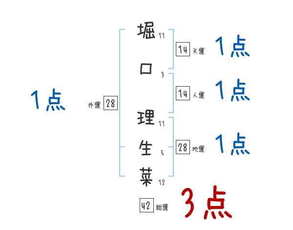 外運![]() | 堀口理生菜さんの外運は28画の1つ星!家庭環境に注意。スポーツで活躍できる能力があるかも。 生活面を象徴する運勢です。外部から受ける影響力を表し、結婚運、家庭運や職場、環境への順応性を表します。 |