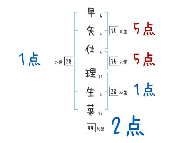 地運![]() | 早矢仕理生菜さんの地運は28画の1つ星!家庭環境に注意。スポーツで活躍できる能力があるかも。 個性を表す基礎的な運勢です。性格形成や対人関係、行動力など家庭環境に影響されます。主に誕生してから20歳くらいまでの若年期の運勢を表します。 |