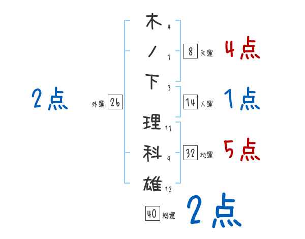 外運![]() | 木ノ下理科雄さんの外運は26画の2つ星!波瀾万丈かも。信頼できる人を大事にしましょう。 生活面を象徴する運勢です。外部から受ける影響力を表し、結婚運、家庭運や職場、環境への順応性を表します。 |