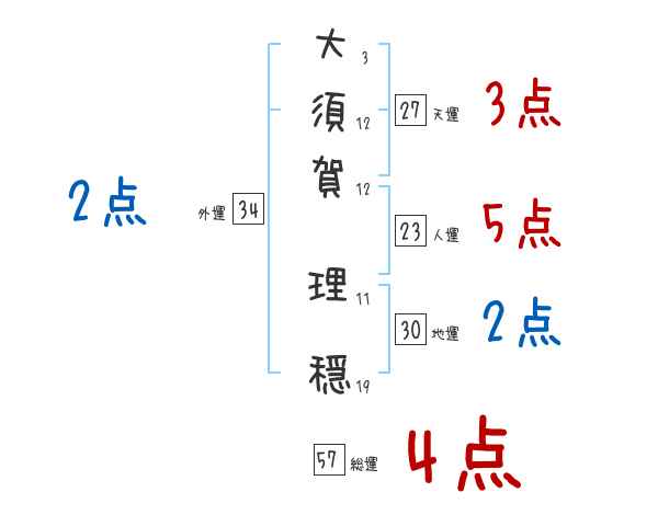 総運![]() | 大須賀理穏さんの総運は57画の4つ星!向上心があり人望がある。地位を得る。 あなたの人生を表す1番重要な運勢です。生涯を通じて影響する総合運となり、主に50歳以降の晩年期に影響を及ぼします。 |