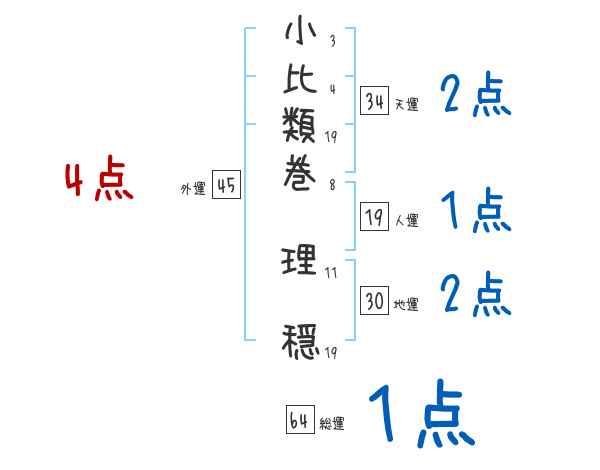 人運![]() | 小比類巻理穏さんの人運は19画の1つ星!優れた才能を持ちますが、協調性が足りないことも。周りの人と協力する事を意識しましょう。 性格や才能などを表す2番目に重要な運勢です。人間関係や協調性、社会的な成功に影響します。主に20歳から50歳ぐらいまでの中年期の運勢を表します。 |