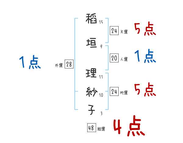 外運![]() | 稻垣理紗子さんの外運は28画の1つ星!家庭環境に注意。スポーツで活躍できる能力があるかも。 生活面を象徴する運勢です。外部から受ける影響力を表し、結婚運、家庭運や職場、環境への順応性を表します。 |