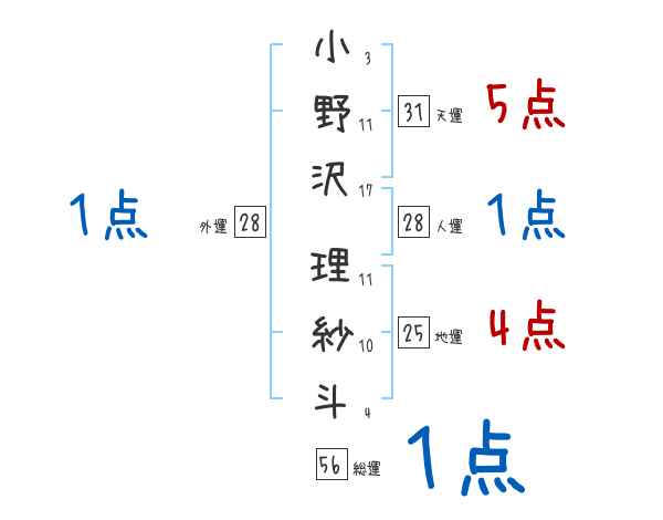総運![]() | 小野沢理紗斗さんの総運は56画の1つ星!消極的で無気力になりがち。誠実な気持ちが必要でしょう。 あなたの人生を表す1番重要な運勢です。生涯を通じて影響する総合運となり、主に50歳以降の晩年期に影響を及ぼします。 |