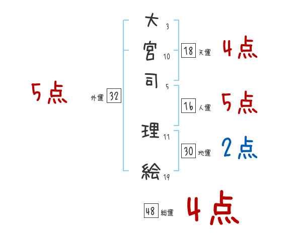 外運![]() | 大宮司理絵さんの外運は32画の5つ星!柔軟性があり成功する。チャンスが多く金運が良い。 生活面を象徴する運勢です。外部から受ける影響力を表し、結婚運、家庭運や職場、環境への順応性を表します。 |
