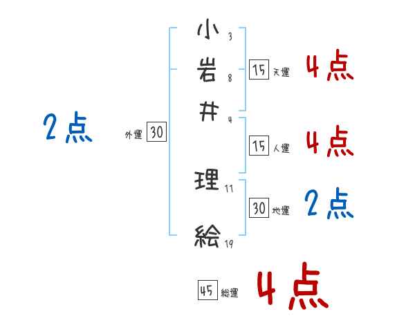 外運![]() | 小岩井理絵さんの外運は30画の2つ星!浮き沈みの激しさに注意しましょう。 生活面を象徴する運勢です。外部から受ける影響力を表し、結婚運、家庭運や職場、環境への順応性を表します。 |