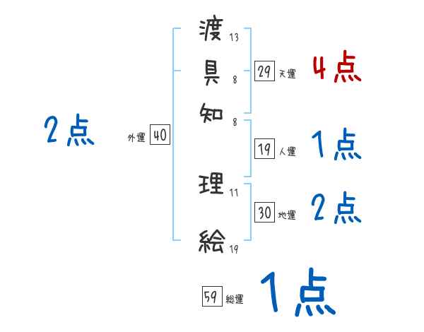 外運![]() | 渡具知理絵さんの外運は40画の2つ星!自信過剰で物事に固執するためトラブルに注意。 生活面を象徴する運勢です。外部から受ける影響力を表し、結婚運、家庭運や職場、環境への順応性を表します。 |