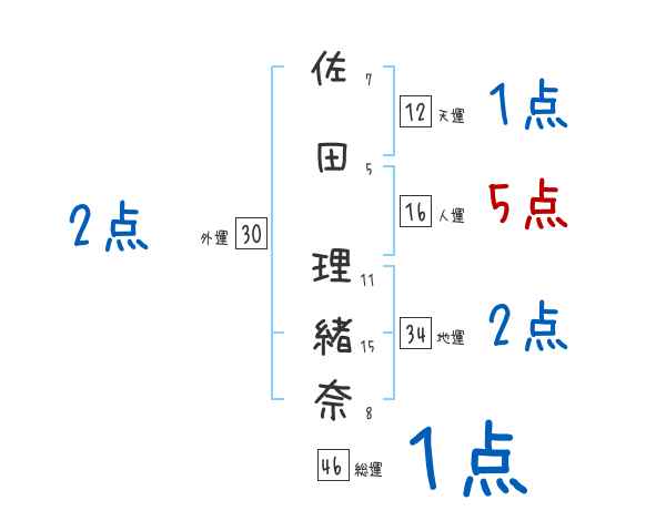 | 外運  | 佐田理緒奈さんの外運は30画の2つ星!浮き沈みの激しさに注意しましょう。生活面を象徴する運勢です。外部から受ける影響力を表し、結婚運、家庭運や職場、環境への順応性を表します。 |