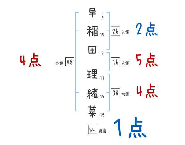 天運![]() | 早稲田理緒菜さんの天運は26画の2つ星!波瀾万丈かも。信頼できる人を大事にしましょう。 家系が持つ宿命的な運勢を表します。祖先から受け継いだ苗字ですので自分の力が及びません。家柄を象徴します。 |