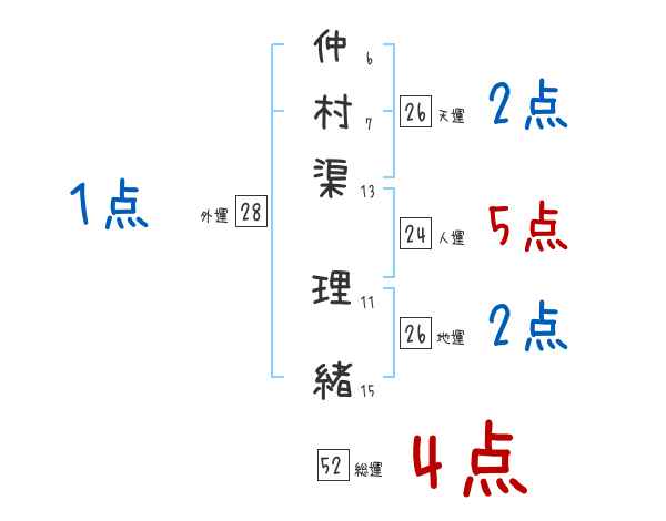 天運![]() | 仲村渠理緒さんの天運は26画の2つ星!波瀾万丈かも。信頼できる人を大事にしましょう。 家系が持つ宿命的な運勢を表します。祖先から受け継いだ苗字ですので自分の力が及びません。家柄を象徴します。 |