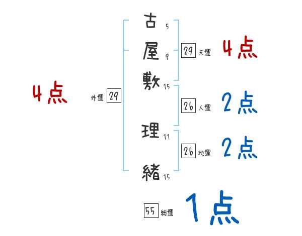 天運![]() | 古屋敷理緒さんの天運は29画の4つ星!完全主義で才能がある。厳格な心の持ち主。 家系が持つ宿命的な運勢を表します。祖先から受け継いだ苗字ですので自分の力が及びません。家柄を象徴します。 |
