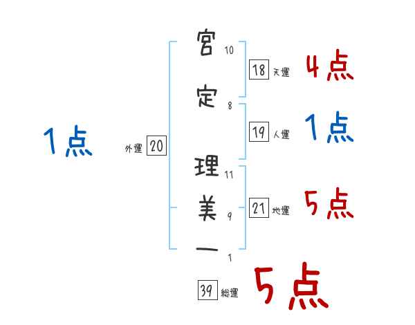 天運![]() | 宮定理美一さんの天運は18画の4つ星!情熱的で剛気。忍耐力があり信頼される。 家系が持つ宿命的な運勢を表します。祖先から受け継いだ苗字ですので自分の力が及びません。家柄を象徴します。 |