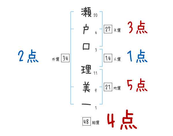 外運![]() | 瀬戸口理美一さんの外運は34画の2つ星!独創性に優れるが、自尊心が強く災難に注意しましょう。 生活面を象徴する運勢です。外部から受ける影響力を表し、結婚運、家庭運や職場、環境への順応性を表します。 |