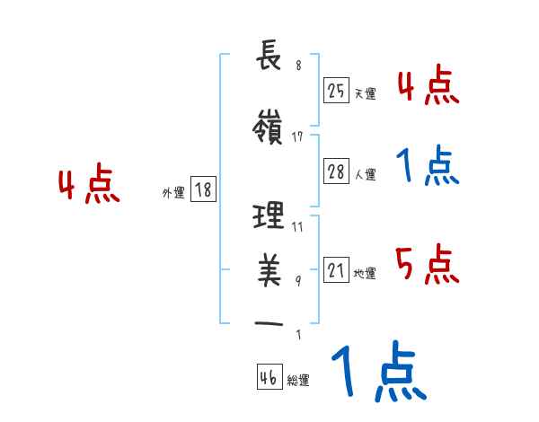総運![]() | 長嶺理美一さんの総運は46画の1つ星!迷走することが多く苦労するかも。目先のことにとらわれないように。 あなたの人生を表す1番重要な運勢です。生涯を通じて影響する総合運となり、主に50歳以降の晩年期に影響を及ぼします。 |